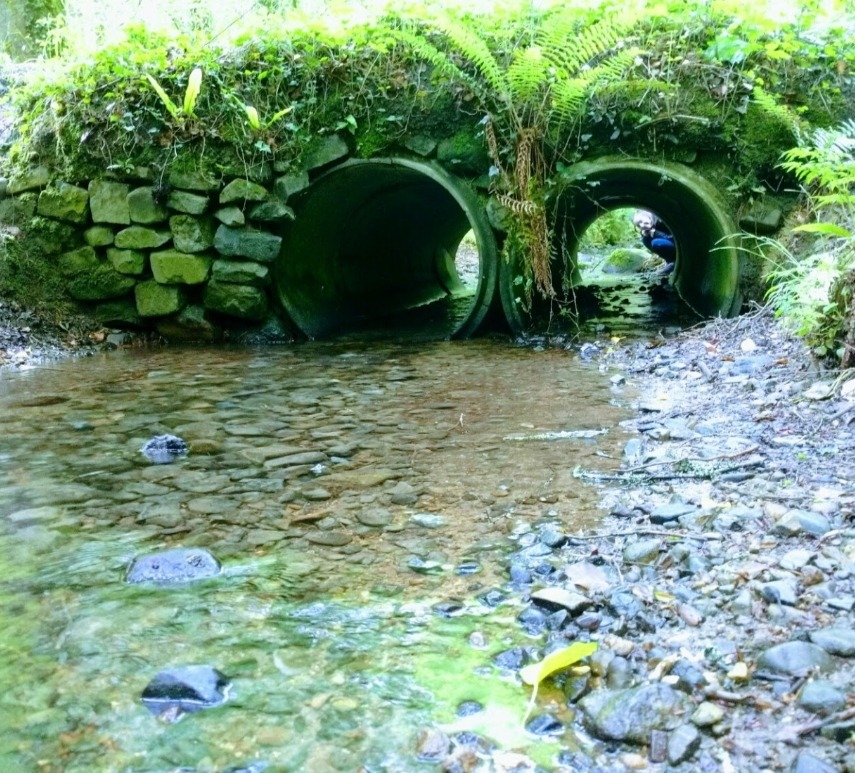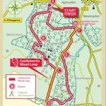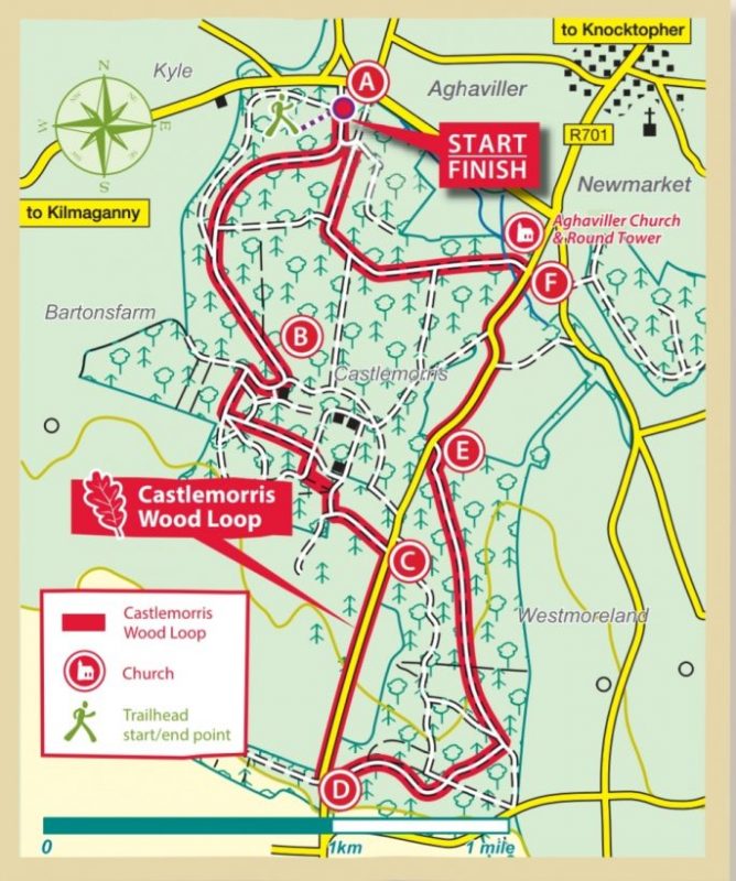 A-B Starting from the car park opposite the Grand Gates, enter Castlemorris Woods and pass the Gate Lodge to reach a metal stile. Cross the stile to join a forestry road and follow the purple (and green and red) arrows. The green and red arrows are for shorter loops. Follow the forest road for over 1km to reach an archway through which stone outbuildings (which were part of the courtyard of Castlemorris House) are visible. The green loop turns left here – you turn right following the purple and red arrows. B-C The loop now sets off to further explore the expansive estate of 200 acres and after approximately 1km joins a minor public road where the red turns left. Turn right here. C-D Now you start a long ascent through the townland of Coalpitparks (passing some large houses on your left) before entering woodland again. After 500m you reach a T-junction where the loop turns left for the return part of the journey. D-E A downhill trek of approximately 1km takes you to a junction with a surfaced roadway where you turn right. After 300m at a right bend you rejoin the red loop as it emerges from the forestry on the left. Turn right here, staying on the surfaced roadway. E-F After approximately 200m both loops (red and purple) turn left and enter Castlemorris Wood by way of a metal barrier. At this point you are just short of Aghaviller Church and Round Tower – 200m along the surfaced road. If you decide to visit the site, remember to return to this junction. F-A Only 500m along this final section of the loop you rejoin the green loop as it comes in from the left. Another 500m takes you to a crossroads of forest tracks where you turn left onto a narrow winding track to emerge on a forrestry road only 200m from the Trail head