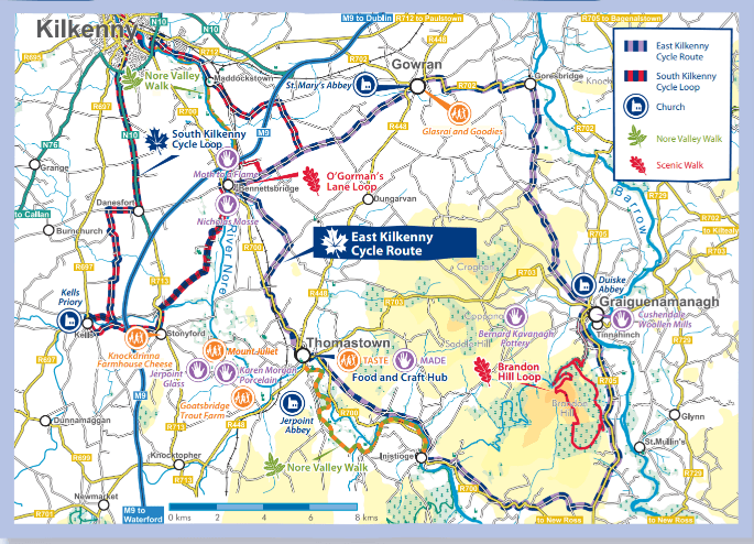 This route is a scenic cycling route linking the most historic and culturally significant towns in east Kilkenny. The towns are perfectly placed along the route to stop for lunch or a cup of coffee. The route uses quiet roads and laneways and provides stunning views of Brandon Hill, the River Barrow and the river Nore.