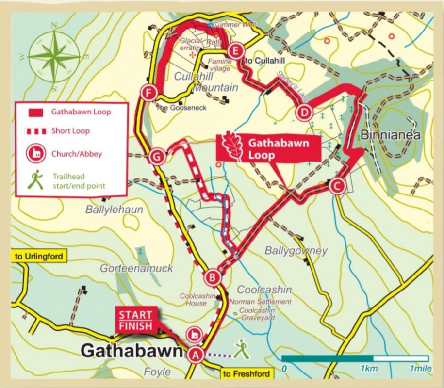 The signs lead you down the road for a short distance before you turn left into the lane. The short loop re joins here. This final stretch through open farmland to Ballygooney Lane, takes you back uphill and then back down to the Trailhead in Gathabawn.