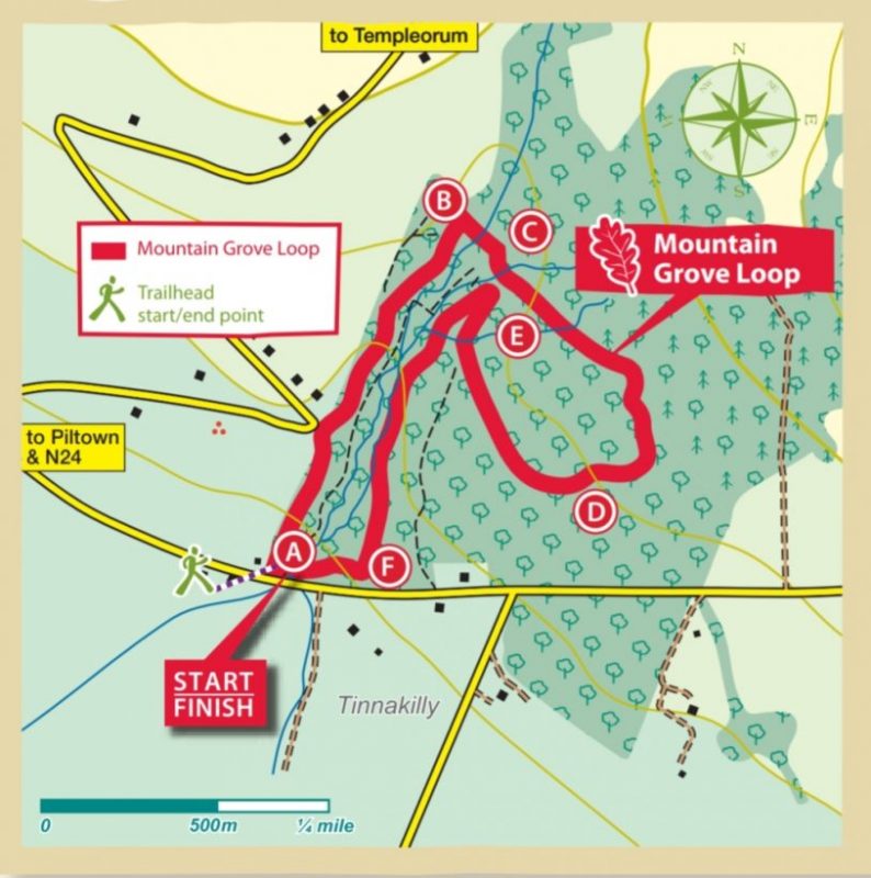 Start from the village of Piltown which is just off the N24 from Carrick-on-Suir and Waterford. Take the R698 northward in the direction of Owning and Kilkenny. After 2km continue straight towards Templeorum as the R698 turns left. At a crossroads after 4km veer right – the trailhead is less than 1km on the left. Note: The trailhead is signposted from Piltown.